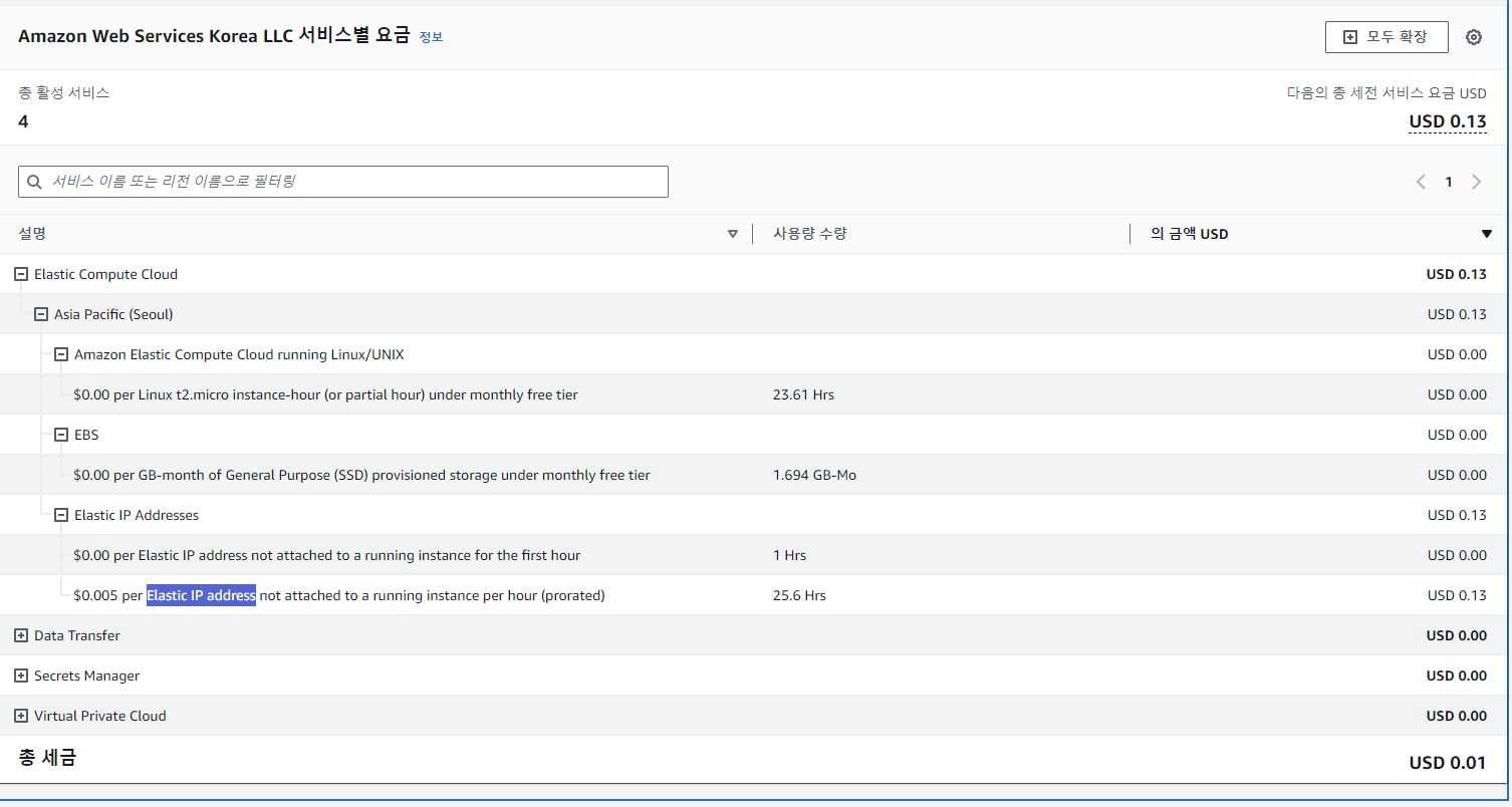 그리하여 필자는 Elastic IP Address 를 바로 삭제했다... 과금량은 많지 않지만 EC2 는 그저 연습용이기 때문에 그걸 위해 과금을 하고 싶지는 않아서 이다.