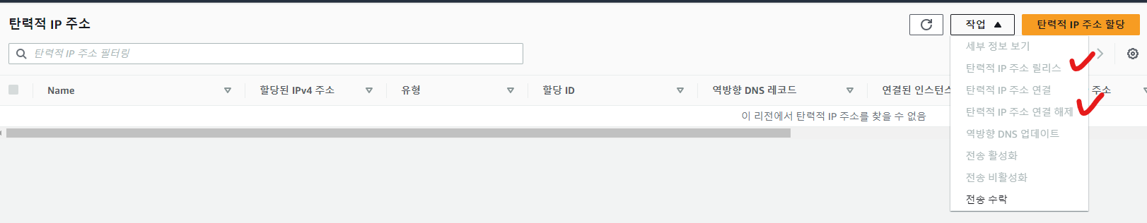 탄력적 IP 주소를 지우는 방법은 먼저 "탄력적 IP 주소 연결 해제" 를 진행한 후 "탄력적 IP 주소 릴리스"를 클릭하면 된다.