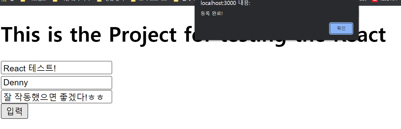input 태그들에 내용들을 입력하고 [입력] 버튼을 누르면 submitReview 에로우 함수를 작동시켜 Axios를 사용해 우리의 서버인 localhost:8000/api/insert 에 data와 함께 post 요청이 들어갈 것이다.