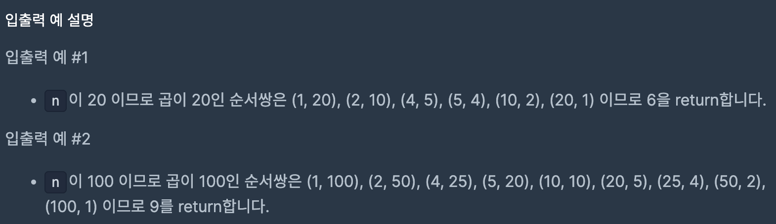 규칙을 풀어 설명하면 20/1 = 몫 : 20 , 나머지 : 0 \\ 20/2 = 몫 : 10, 나머지 0 이란 규칙이 눈에 띄었다.