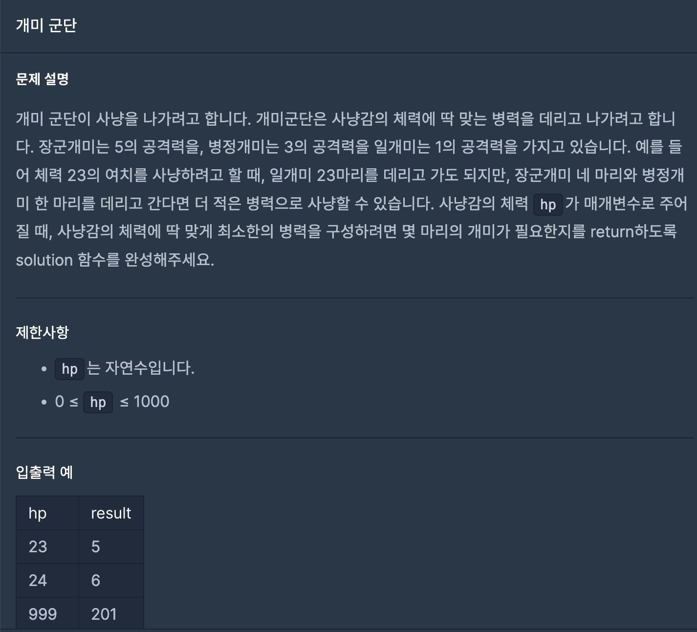 반복문 내에는 차례대로 몹의 남은 HP 와 개미들의 공격력을 차례대로 나누어주어 필요한 계급별 개미들의 수의 총합을 계산했고 아래 mopHp %= d 를 통해서 사냥감의 남은 HP 를 계속 계산해주어 totalCount 계산 로직에 제공하였다.