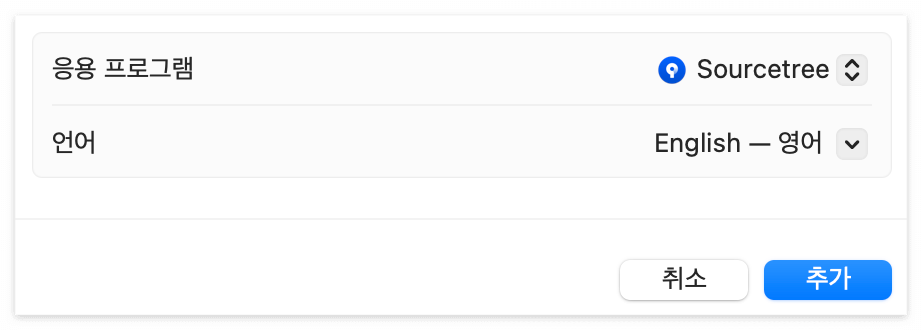 그다음 아래와 같이 응용 프로그램 : SourceTree 선택 후 언어는 영어로 설정 And 추가.