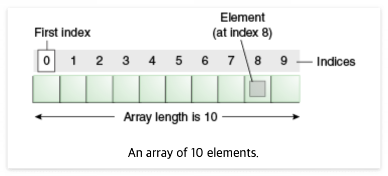 상기 이미지를 참고해보면 길이가 10인 배열을 선언하였고 시작 인덱스는 당연히 0이고 마지막 인덱스는 9 이다. 그리고 각각의 인덱스의 공간(Element) 에는 값이 들어간다. 상기 이미지를 코드로 표현하자면 아래와 같다. 배열의 값은 int 라고 가정해보겠다.