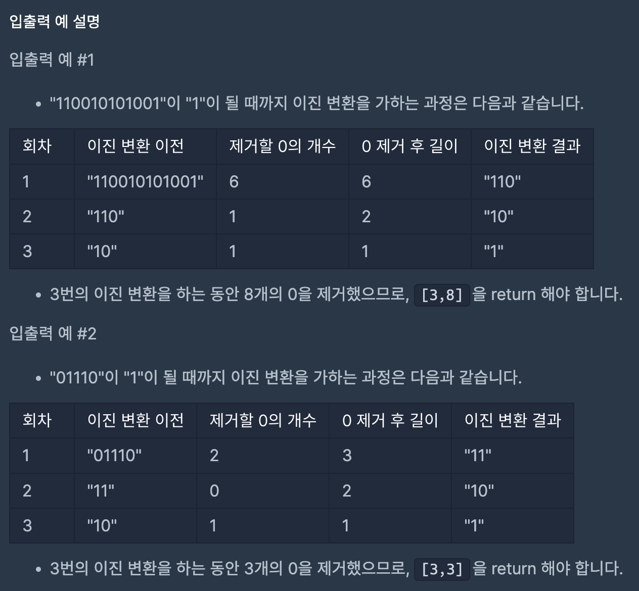 - 4. "1" 이 되면 결과 값 추출 -> [ "이진 변환 round 반복 횟수" , "이진 변환 과정에서 반복으로 제거된 0 의 총 갯수" ]