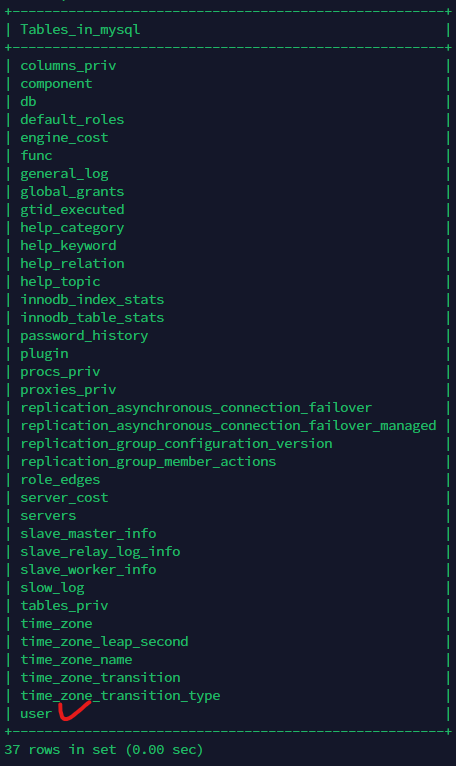 mysql DB 내 테이블 조회 && 맨아래 user 테이블 확인