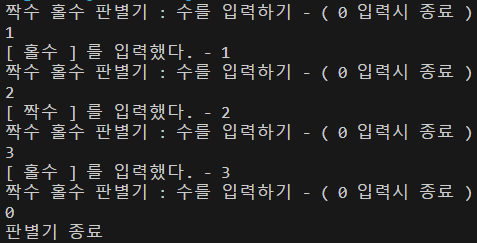 0 입력시 종료되는 짝수 홀수 판별기 이다. 아래는 실행 결과이다.