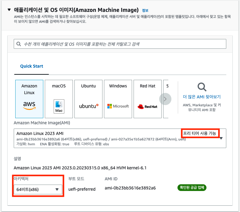 전 기본으로 설정되어 있는 "Amazon Linux 2023 AMI" 사용하도록 하겠습니다.