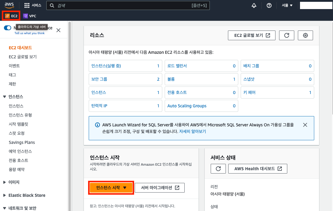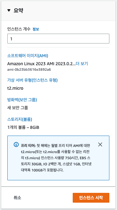 위 영역에서 인스턴스 개수가 1인지 확인하고, 아래 "인스턴스 시작" 을 클릭합니다.
