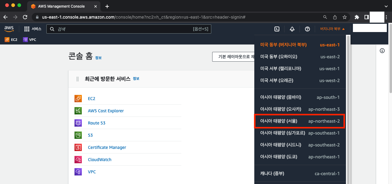 해당 부분은 책과 거의 똑같지만, 나중에 행여나 놓칠까 해서 남겨놓은 내용입니다. AWS에 로그인하면 오른쪽 위에 현재 설정되어 있는 지역이름이 표시됩니다.