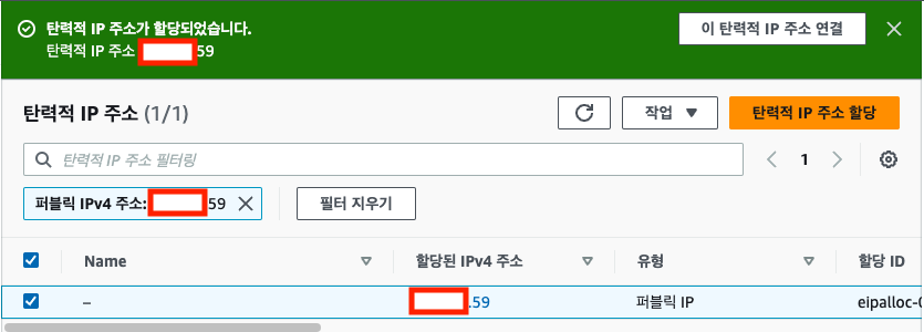 그러면 아래 처럼 할당이 완료됐다는 메세지와 함께, EIP 목록에 방금 생성한 EIP가 확인됩니다.