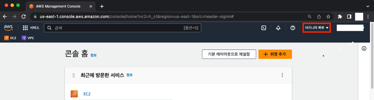 1. 최초에 로그인 시, 현재 접속 중인 지역과 다른 지역이 표시됨. 브라우저 주소도 us-east-1 로 표기되어 있음