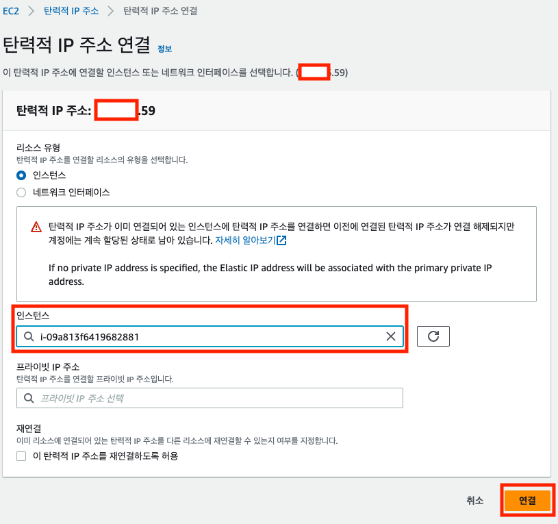 이런 사태를 방지하기 위해 바로 "이 탄력적 IP 주소 연결" 버튼을 클릭해줍니다.