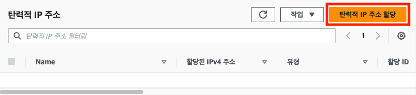 우측 상단에 표시된 "탄력적 IP 주소 할당" 버튼을 클릭해주시면, EIP를 할당받기 위한 화면이 나타납니다.