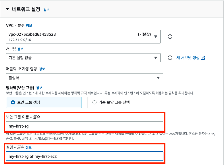 편집 시, 아래 정보들을 편집할 수 있게 됩니다. 다른건 다 기본값을 사용하고 "보안 그룹 이름"과 "설명" 만 작성해줍니다.
