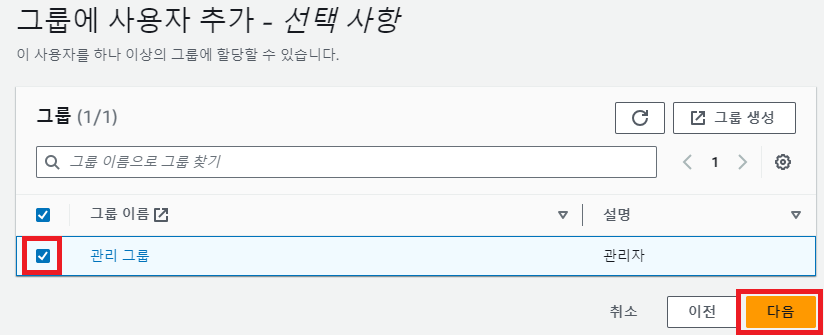 - 방금 생성한 그룹을 체크 후 "다음" 버튼 클릭.