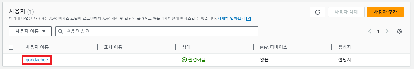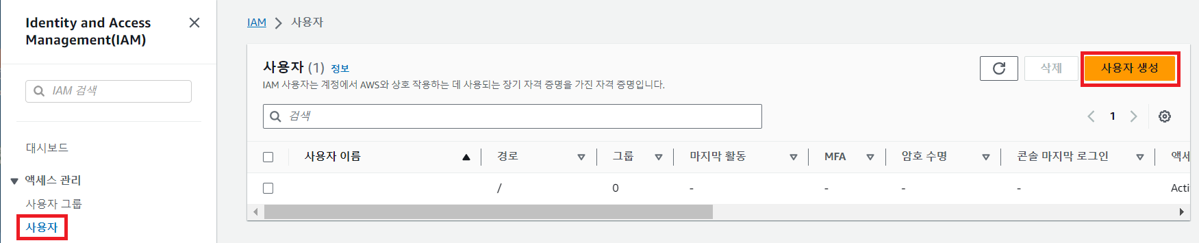 - 액세스 관리 > [ 사용자 ] 클릭 > [ 새용자 생성 ] 을 클릭 한다.