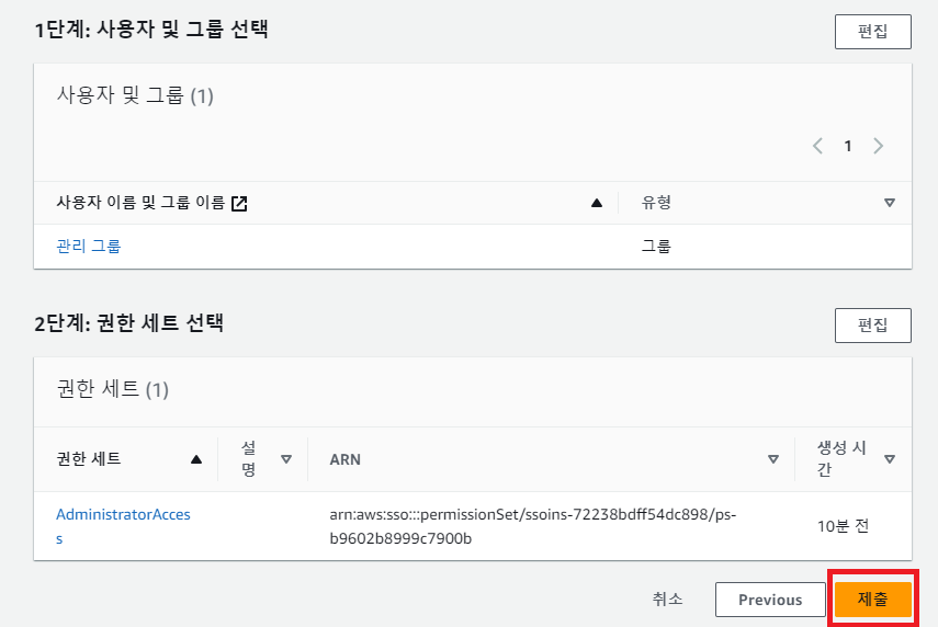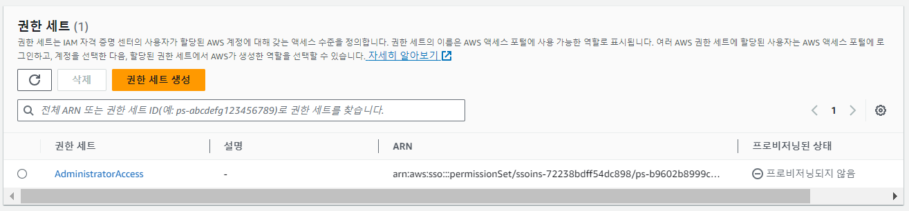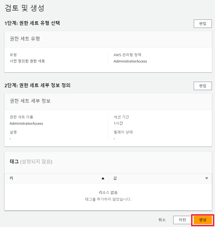 - 기본 설정을 유지하며 [ 생성 ] 클릭 후 권한 세트가 생성 된다.