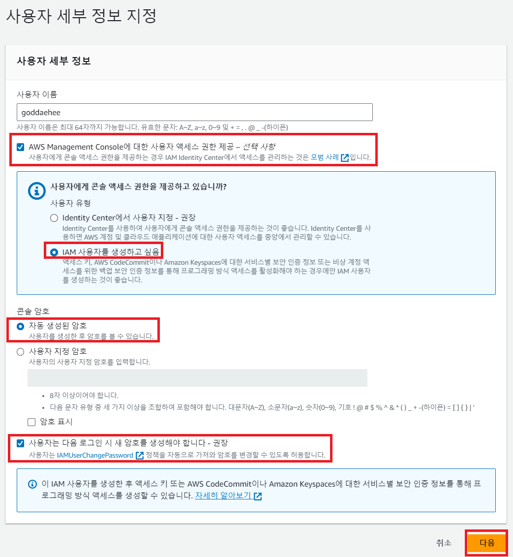 - AWS Management Console 체크 하자. ( AWS Management Console (웹페이지)로 로그인을 가능 하도록 설정 )