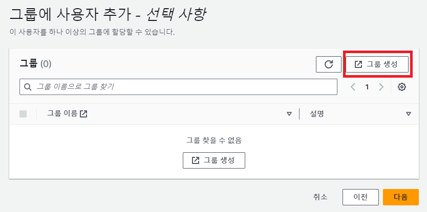 - "그룹 생성" 버튼을 클릭하여 IAM 그룹을 만들어 주자.