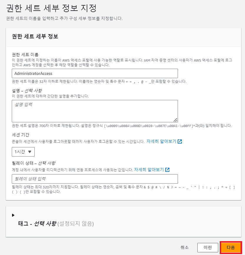 - [ 사전 정의된 권한 세트 ] > [ Administragor Access ] > 다음 클릭