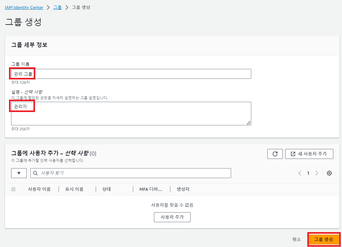 그리고 "사용자 그룹 생성" 버튼 클릭.