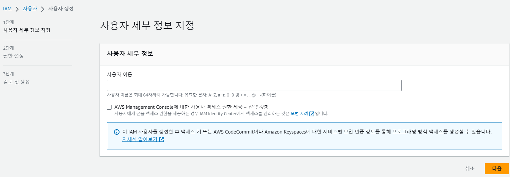 - 사용자 이름 : 신규 생성하려는 IAM 사용자명을 작성한다.
